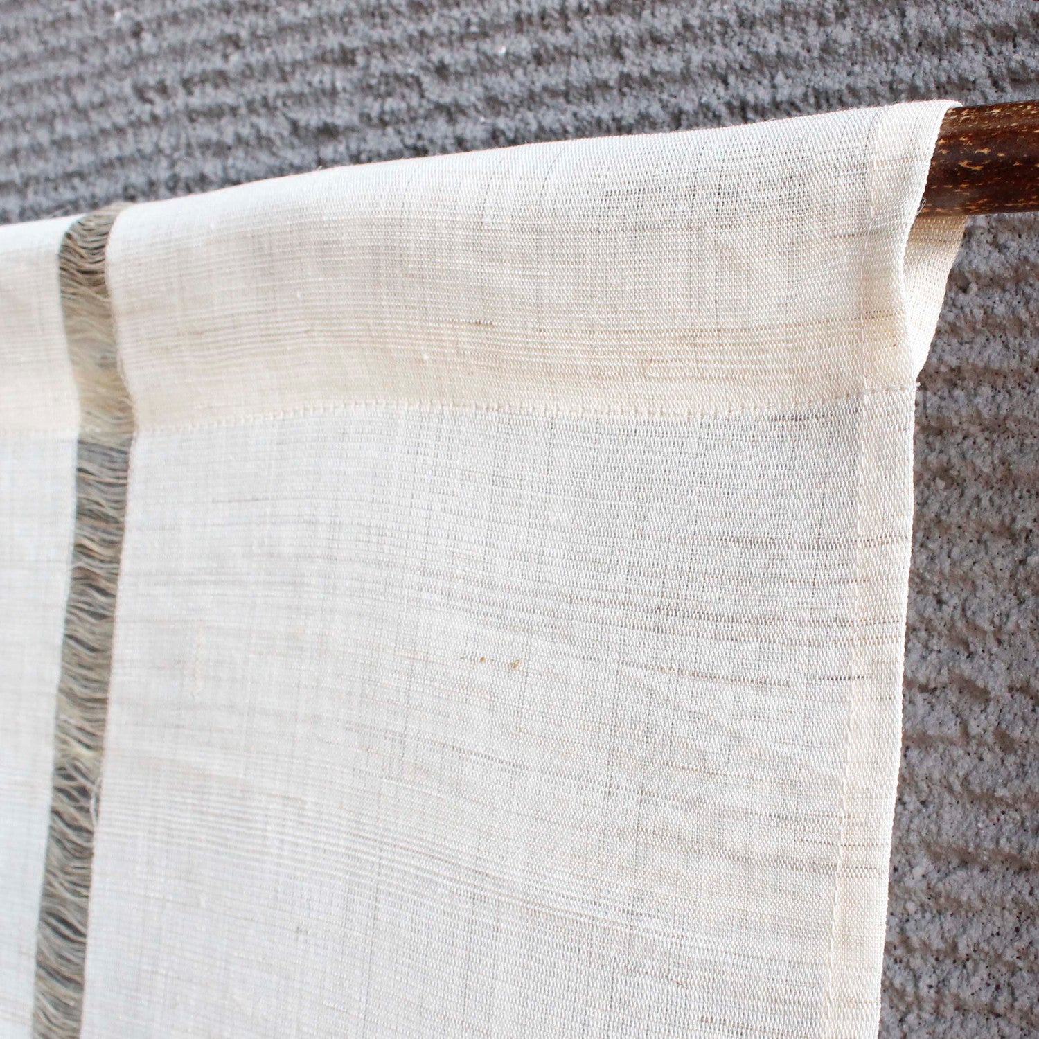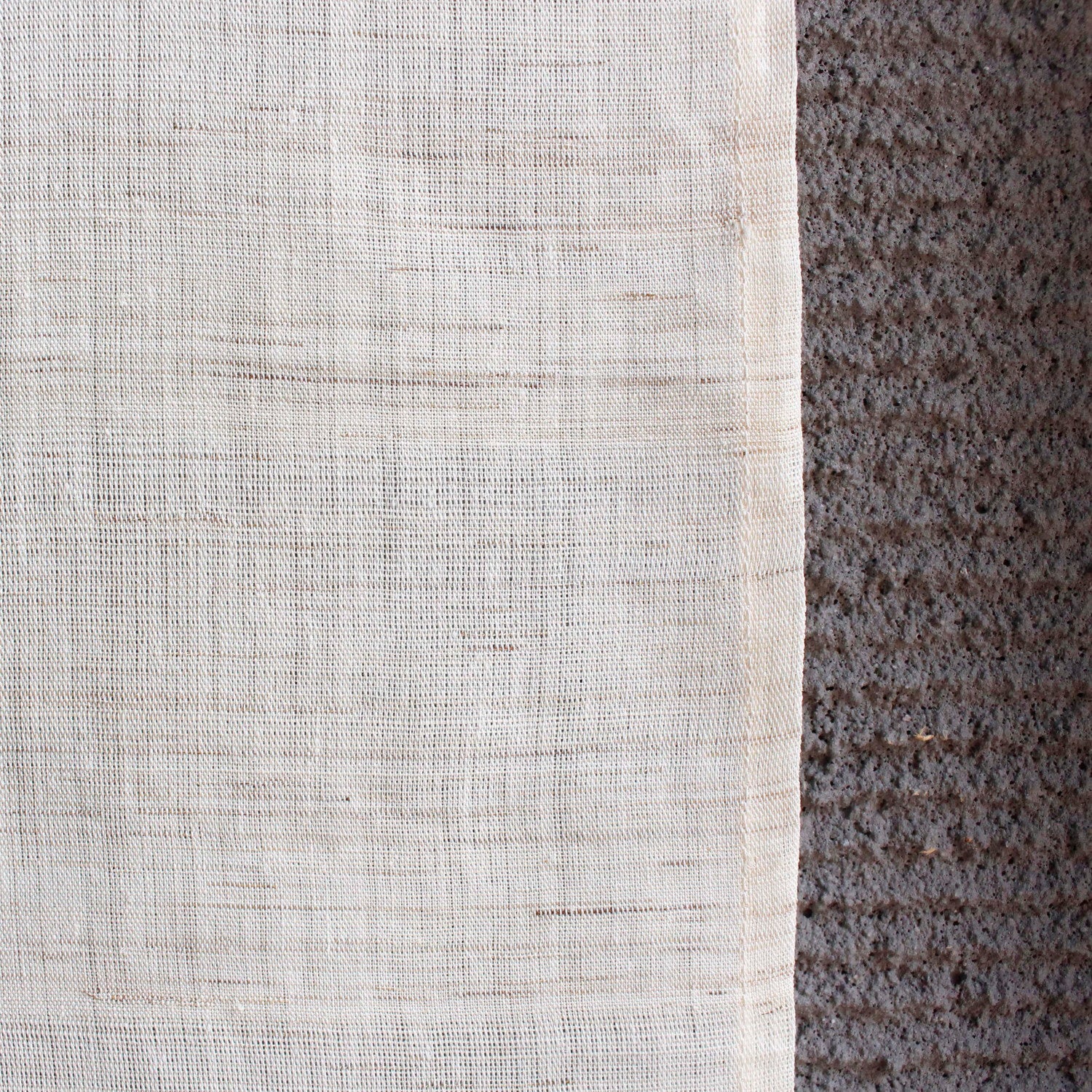 This noren is made from 100% handwoven ramie fabric known as Iono-ori. The central warp threads of the fabric are removed to create a delicate sheer effect. While the fabric has a soft and gentle texture, it also retains a firm structure, resulting in a noren full of presence and refined elegance.