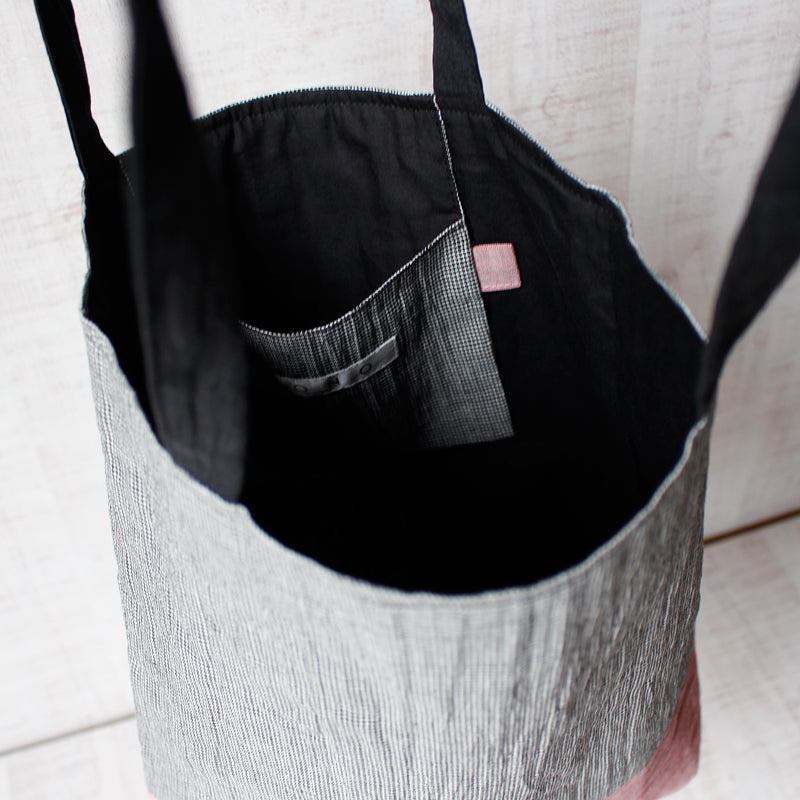 A folding bag made of ramie material. This bag can be folded into a small size and stored in pocket. Very useful when shopping. The fabric of this bag is called "Chijimi-fabric" in Japan.Chijimi-fabric is one of the finest hand-made textiles in Japan, 100% make of ramie.Its refined artisan technique produces unique wrinkles called "Shi-bo", which gives cool and light texture and yet soft on skin.
